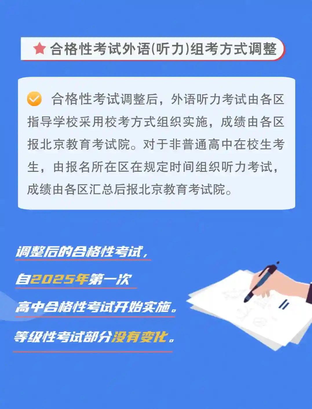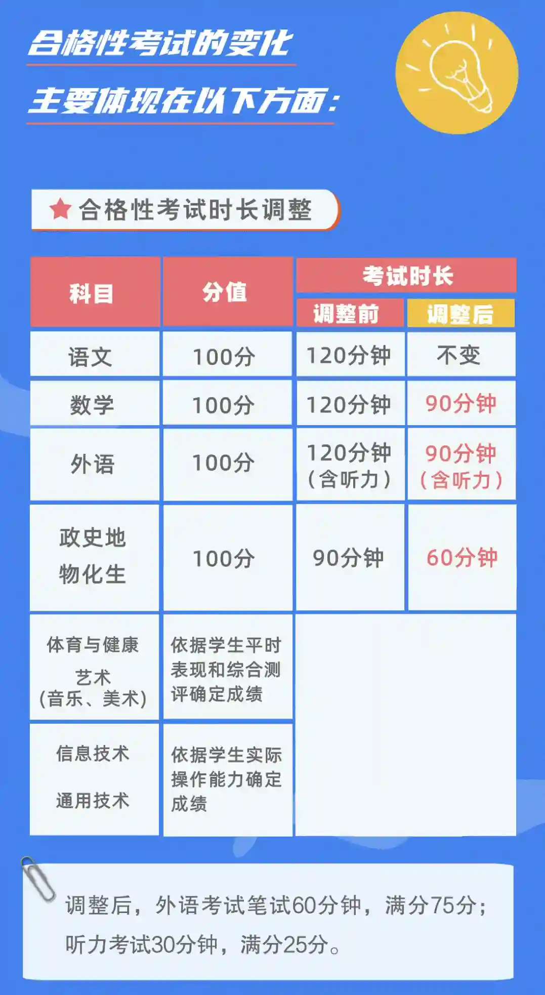 本次合格考是改革后的首次考试。根据新的考试方案,部分科目考试时长缩短,外语听力组考方式有变,等级性考试部分没有变化。具体变化如下↓↓↓
