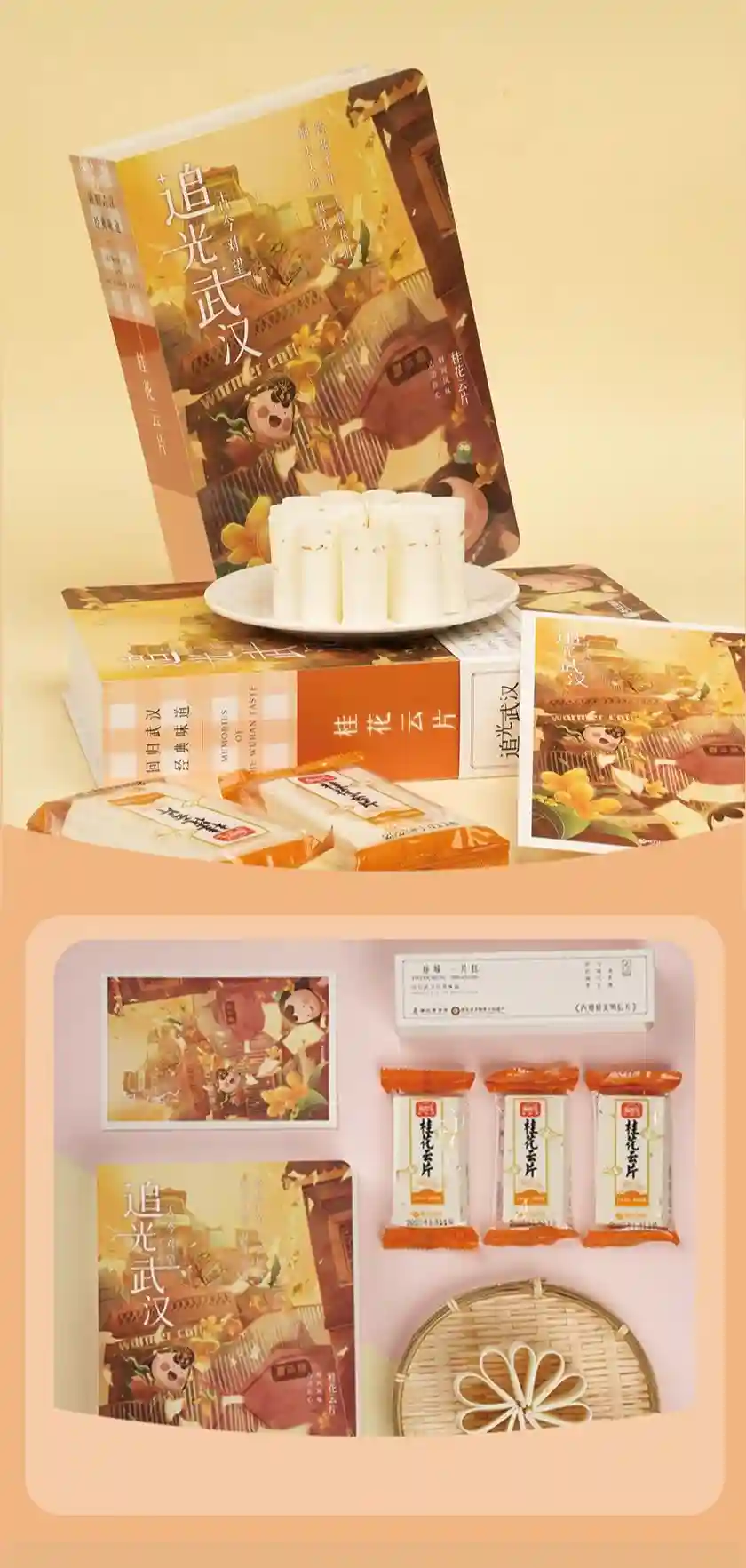 “追光武汉”系列糕点共10个产品,其中既有武汉家喻户晓的传统手工糕点,如武汉云片糕、桃片糕、麻烘糕、桂花糕,也有黄油海盐曲奇饼干、巧克力曲奇饼干等新式糕点。这些传统手工糕点,每一款都承载着独特的制作工艺,是武汉美食文化的结晶。