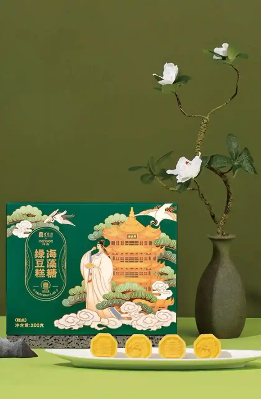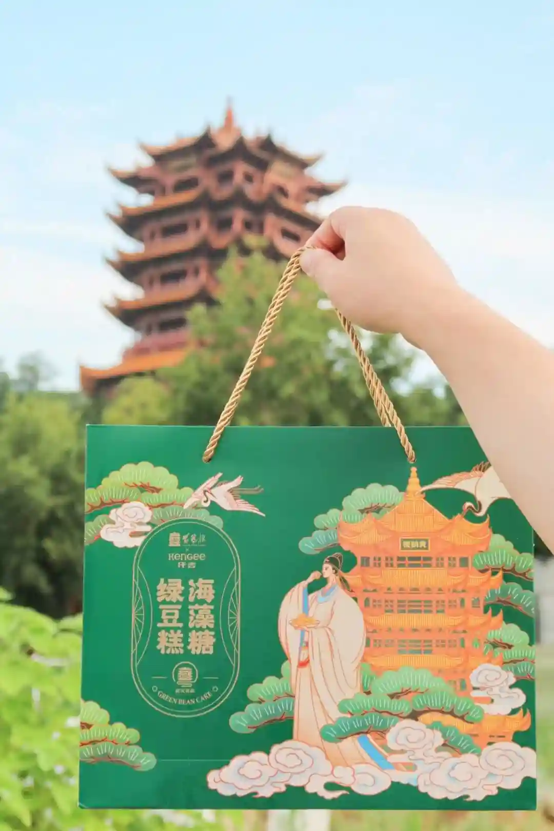 2023年6月,仟吉与黄鹤楼联名推出海藻糖绿豆糕礼盒,将美食与武汉城市文化相结合融入产品之中。这款礼盒的包装设计独具匠心,采用新中式写实画风,真实还原黄鹤楼的轮廓结构和建筑细节,同时融入李白等历史典故,通过细腻的笔触和优美的历史典故述说着武汉的城市历史。