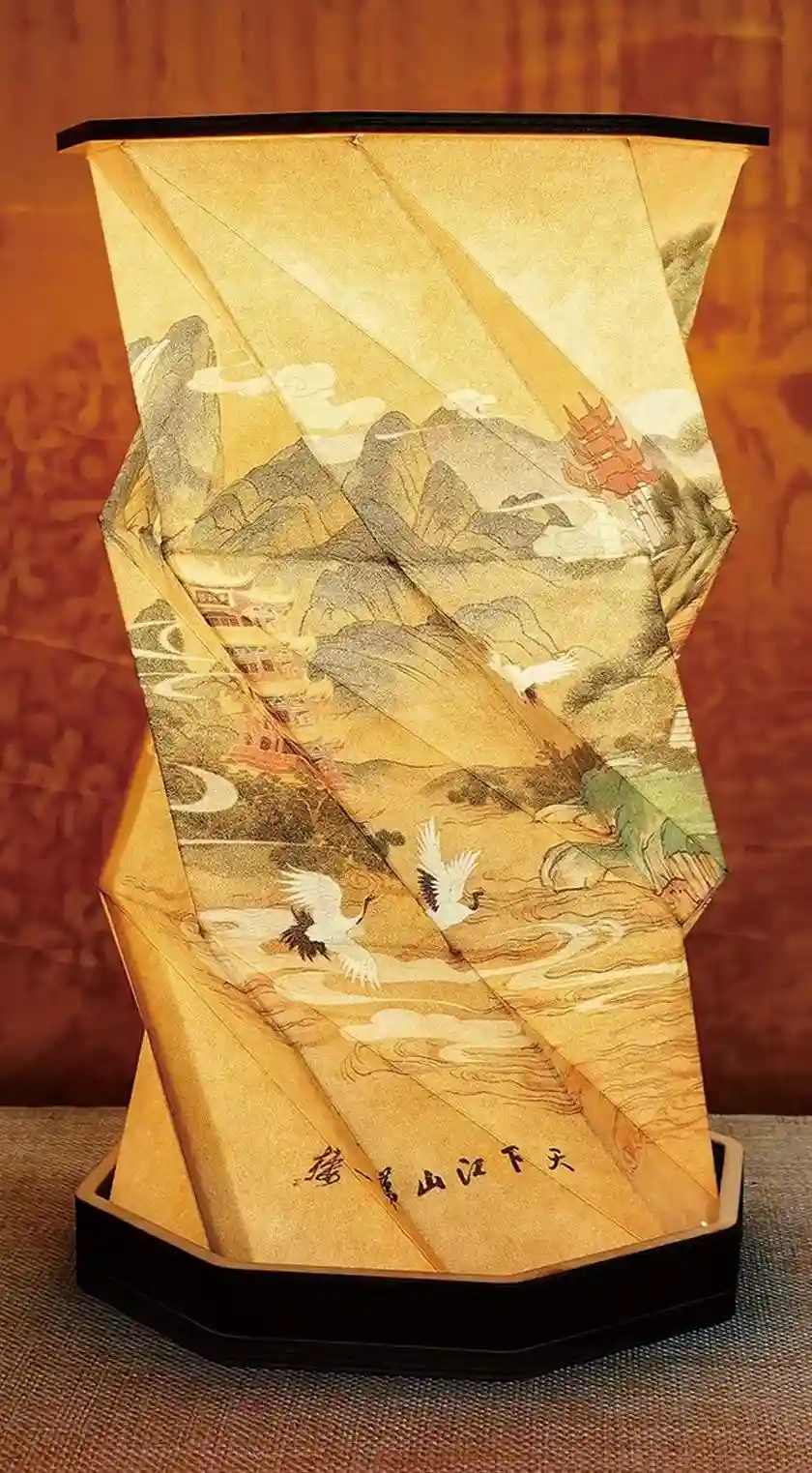 黄鹤古韵旋转灯将经典的黄鹤元素展现得淋漓尽致,木质结构的旋转灯,可以折叠,打开后会缓缓变成一盏纸灯,杜邦纸灯上呈现一幅古画,展现了黄鹤在黄鹤楼周围翩翩起舞的场景,同时也把搁笔亭、千禧钟等黄鹤楼公园内的景观融入画中,可谓是独具匠心。