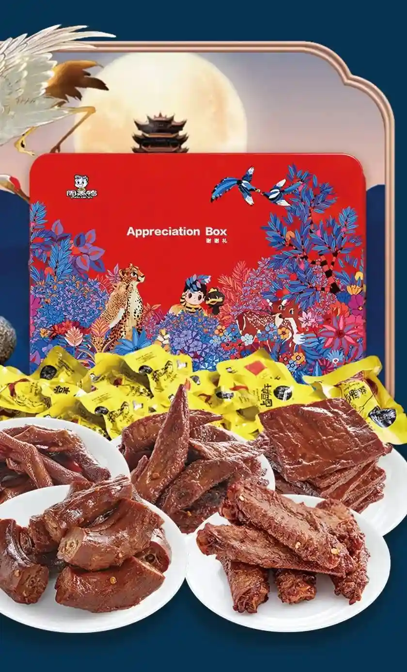 礼盒的外观设计,以红色为主色调,希望给到人们温暖、阳光的感觉。手绘图更是描绘出一幅五彩斑斓、栩栩如生的童话世界,画面有大小两只豹子、亲密梅花鹿、嬉戏喜鹊,分别代表亲情、友情、爱情,借此表达感恩之情。这些巧妙的设计,不仅提升了礼盒的视觉冲击力,更使其成为传递城市文化与美食故事的重要载体。