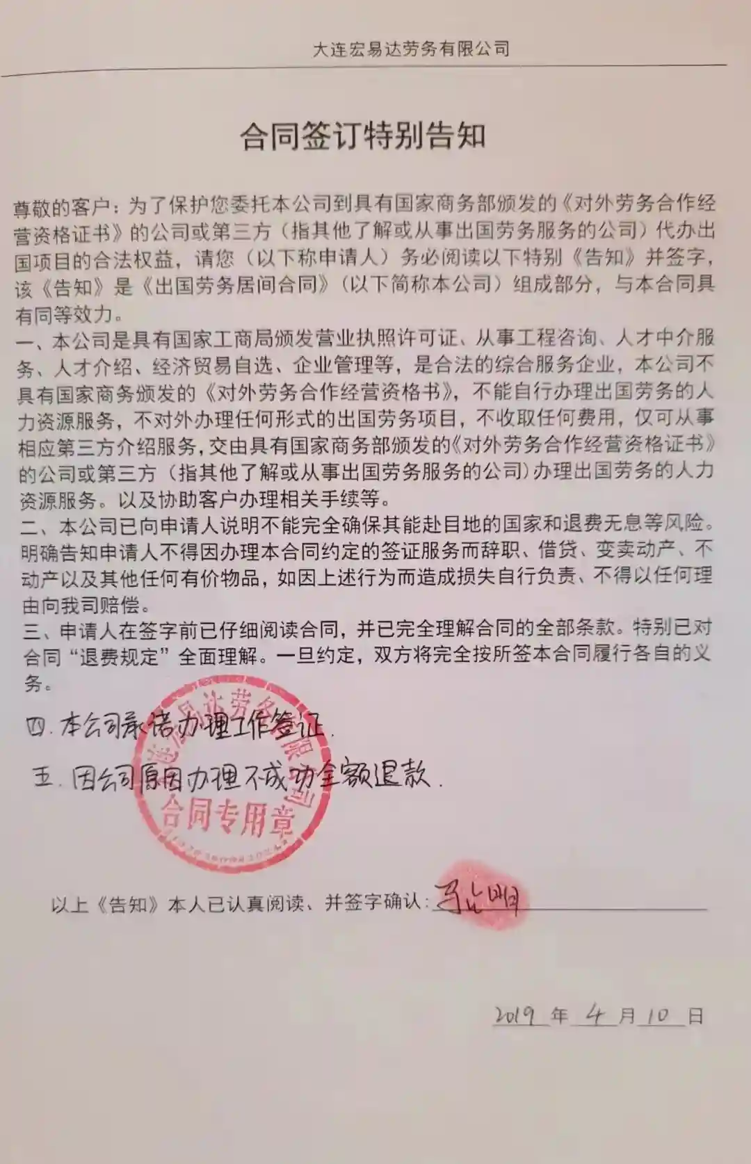 有类似遭遇的,还有来自黑龙江哈尔滨的张国义。2019年5月他与宏易达公司签订了代办出国务工合同,前期交付了50000元中介服务费,约定30至50个工作日办结出国手续,但最后同样办理失败。