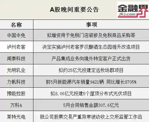 金融界6月7日消息今日晚间重要公告抢先看——力帆科技前5月新能源汽车销量9421辆同比增长8705%、海汽集团收问询函:要求说明海旅免税的核心竞争力及持续盈利能力、光明乳业拟约25亿元投建定远牧场群项目……