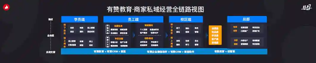 在学员和客户端:借助企业微信的触达能力,线下校区通过地推邀约,线上网校通过试听、分销、直播等运营动作沉淀学员到有赞CRM;总部可进行学情分析、客户分层、精准营销、场景营销。