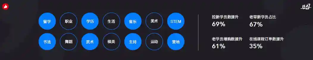 当前有赞教育行业解决方案主要覆盖:留学游学、职业教育,学历提升、生活技能、素质教育等细分领域,今年拉新学员数上涨了69%,老带新占比67%,老学员增购量提升61%,在线课程订单数提升35%,这些都是运营学员私域流量池,深挖学员单客价值方面的成果。