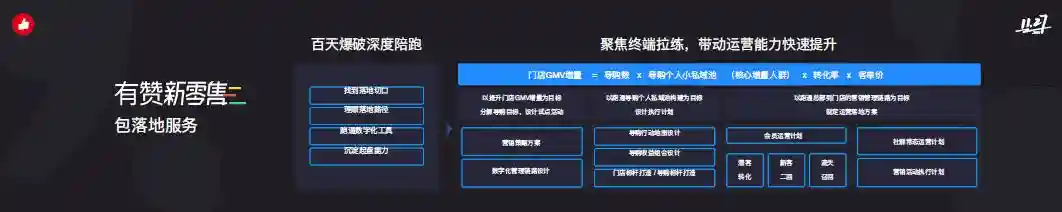 例如在终端门店侧,提供运营策略方案和数字化管理链路设计;在导购侧,帮助商家进行导购行动地图设计、导购收益组合设计,以及门店和导购标杆打造;在运营侧,帮助商家制定会员运营计划、社群运营计划、营销活动执行计划等等一系列新零售落地的运营服务专项内容。通过系统交付-试点方案设计-单场活动爆破-落地跟踪这4个阶段,用100天的时间深度陪跑,帮助企业建立新零售升级的基础能力。