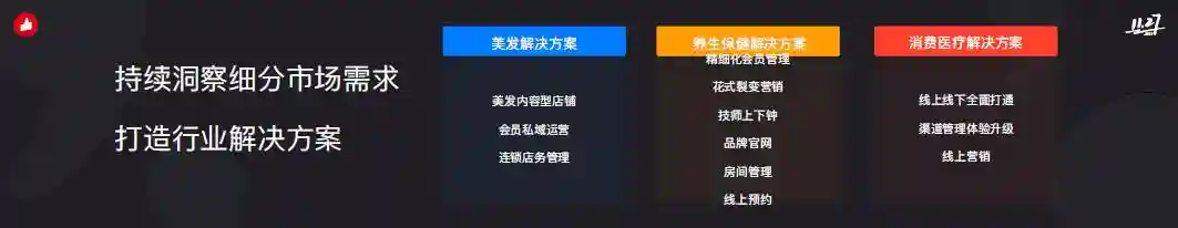 除了我们发展了一段时间的教育和美业外,我们也尝试与更多的生态合作伙伴共建探索新的行业解决方案,今年我们与订单来了共创了有赞酒店。