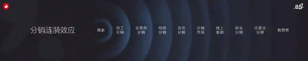 商家的分销是从内到外,从轻到重,由远及近这样一个过程。首先可以影响内部的员工,包括销售员等等这样一些内部的团队,进而不断往外扩散,往外圈寻找更多的机会点,比如说寻找老客户,我们的一些分销商,我们的一些上下游的合作伙伴,达人、主播等等,来帮忙去做推广。而越往外,商家的掌控力、影响力越衰减,更多靠利益连接。