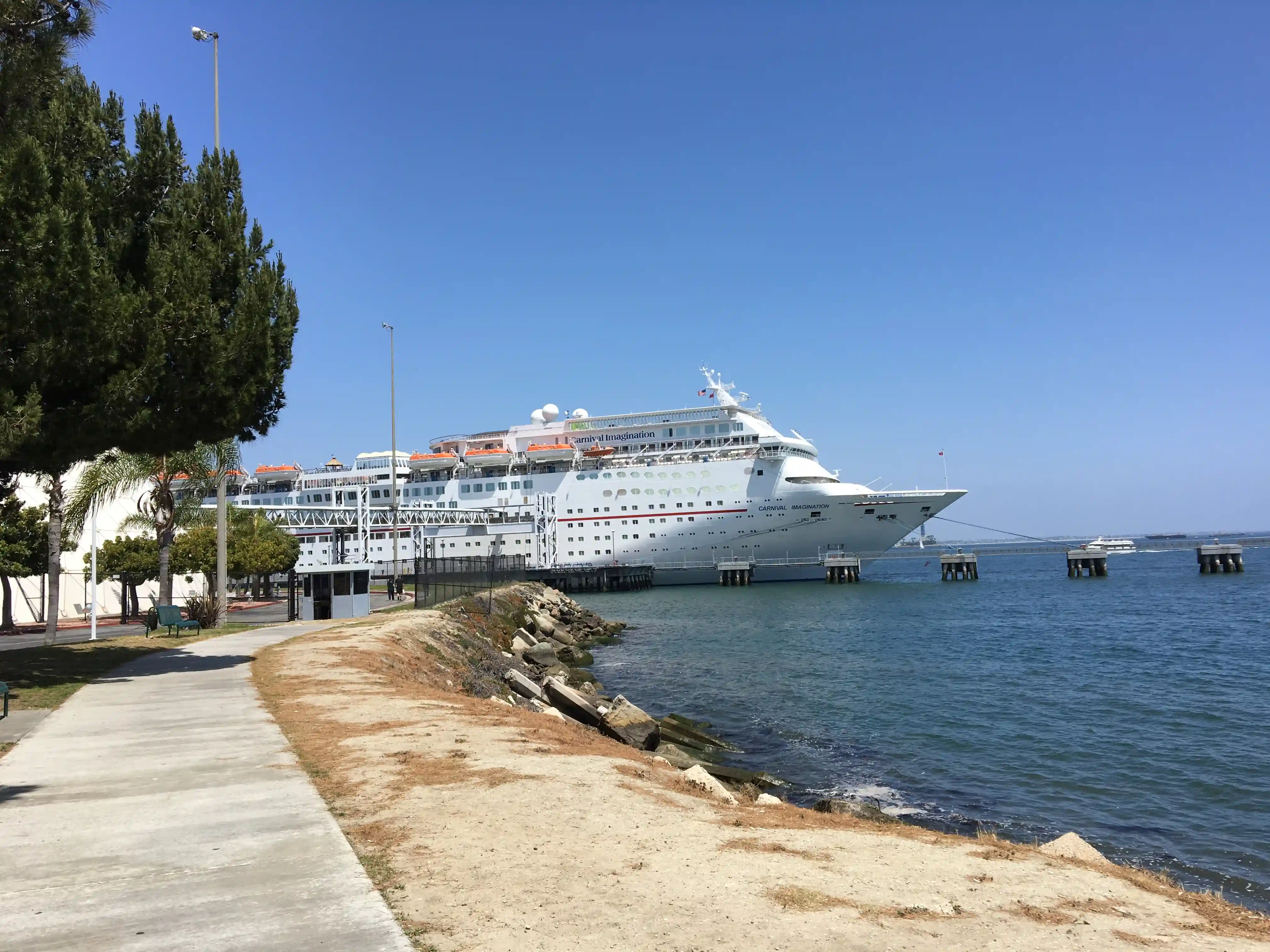 下午2点左右赶到洛杉矶的长滩码头,办理手续,准备登船。邮轮外貌,在邮轮处登记上船。