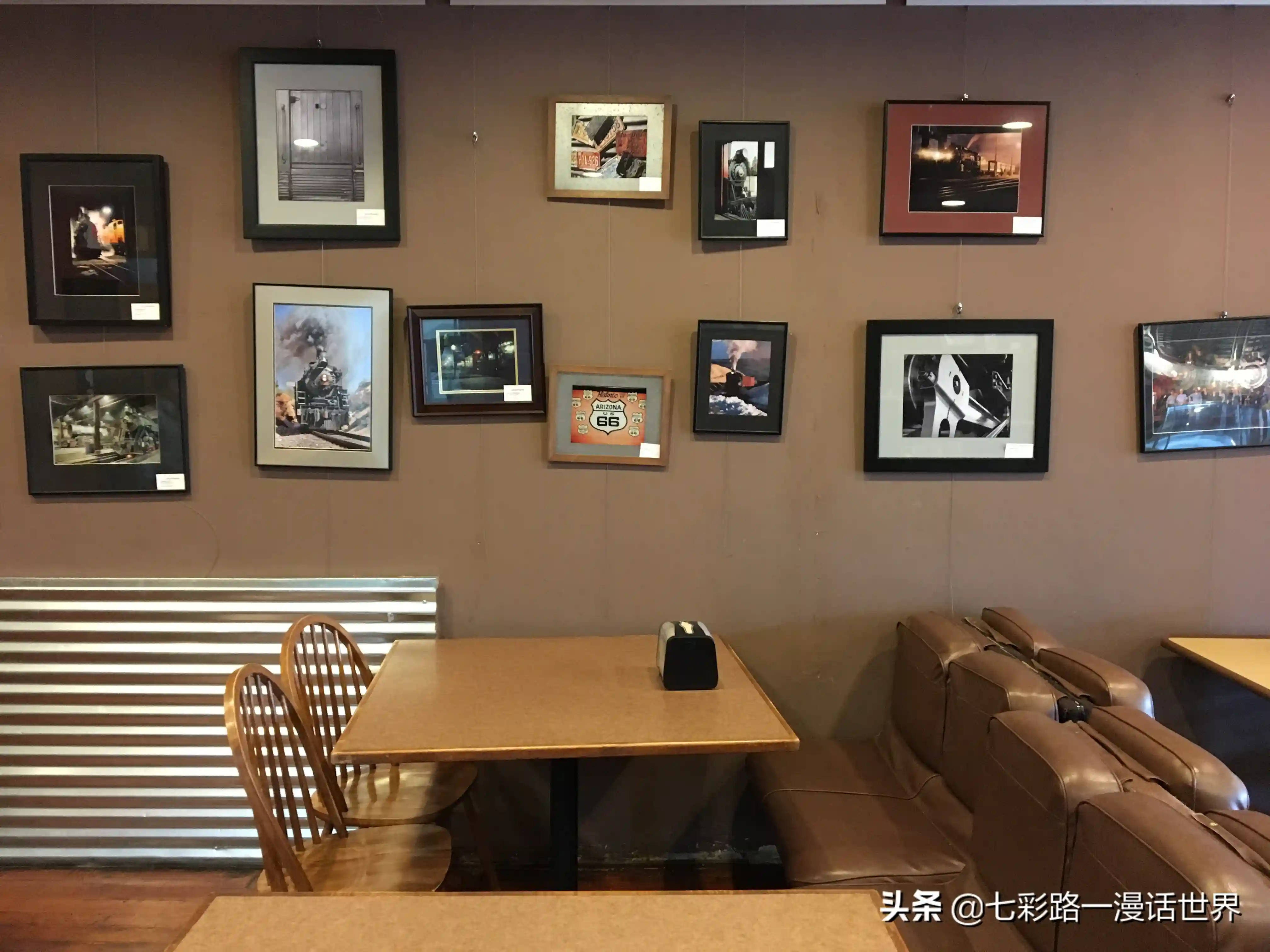 由于今天出来早,一路赶到66号公路旁有名的小镇吃早餐,这家小店很有特色,特别是墙上的这张地图,到过此店的人都把自己的家乡标志出来,从地图上看到过此店的人以美国和欧洲的人最多,我也在此地图上做了自己家乡的标志,到此一游!
