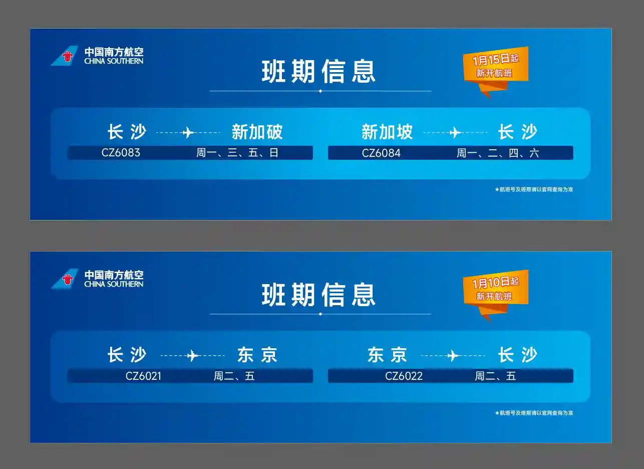 为满足广大旅客国际出行需求,南航计划于2025年1月10日起恢复长沙直飞东京航线,2025年1月15日起恢复长沙直飞新加坡航线,两条航线均由空客A320机型执飞。