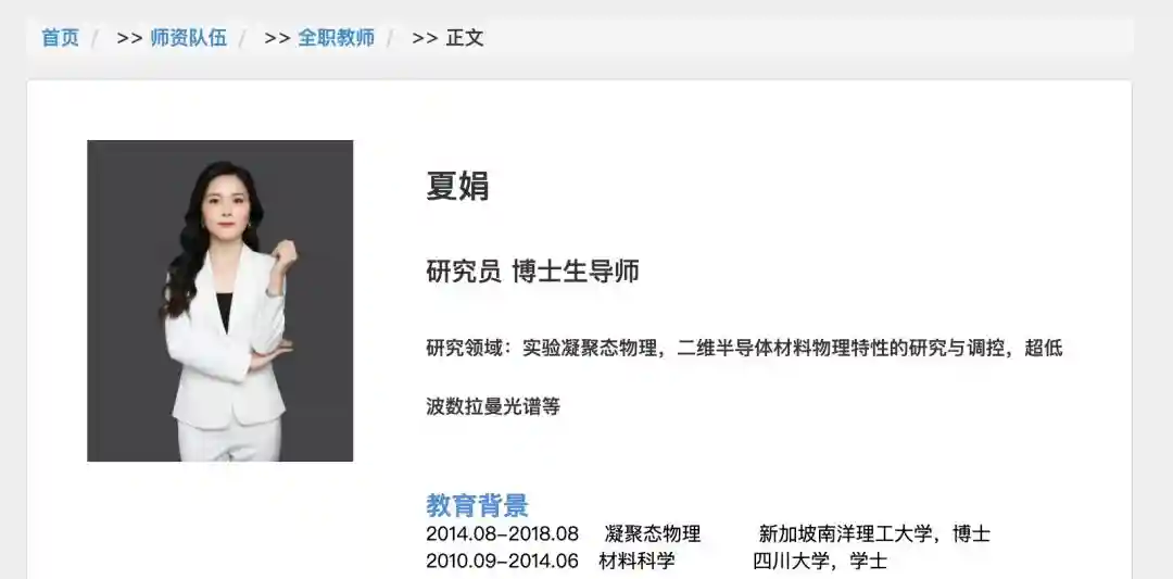 资料显示,夏娟在Nature,NaturePhysics,NanoLetters,ACSNano等高水平期刊上发表研究成果近20项,包括电子科技大学首篇NaturePhysics论文;她还以项目负责人身份主持国家重点研发计划、国家自然科学基金等多个科研项目。