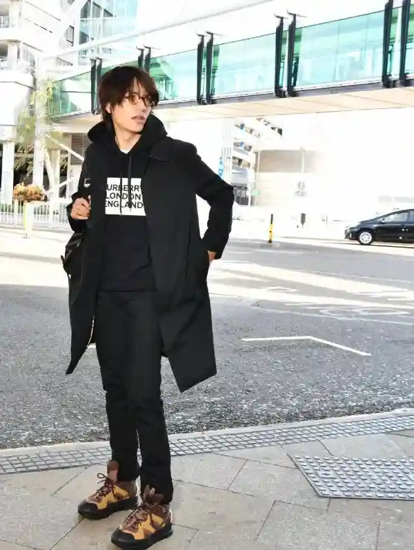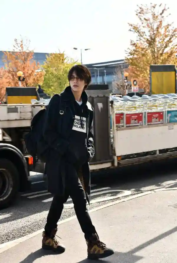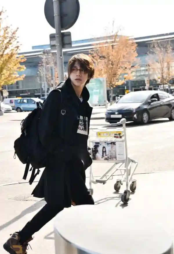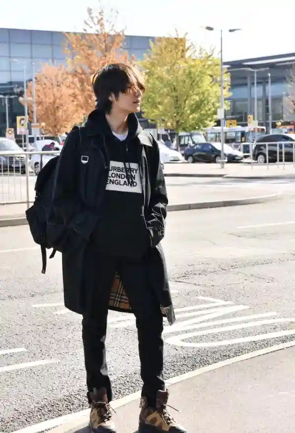 陈坤身穿一件黑色的长款连帽卫衣搭配牛仔裤,脚踩迷彩休闲鞋,背着双肩包,脸上还架着框镜,学生气息十足,一头微长的头发有些凌乱,颇有几分日系美少年的既视感。