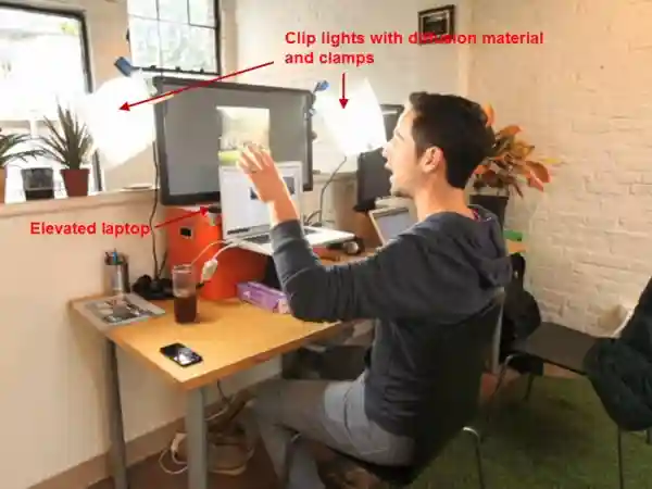 在面试时,我们保证能让自己的五官清晰立体即可,这里推荐各位面试者至少能保证光源在面部的正前方并高于或平行于你的摄像头,有条件的可以将灯光设置在面部左前、右前2.5-3.5英尺的位置,像这样: