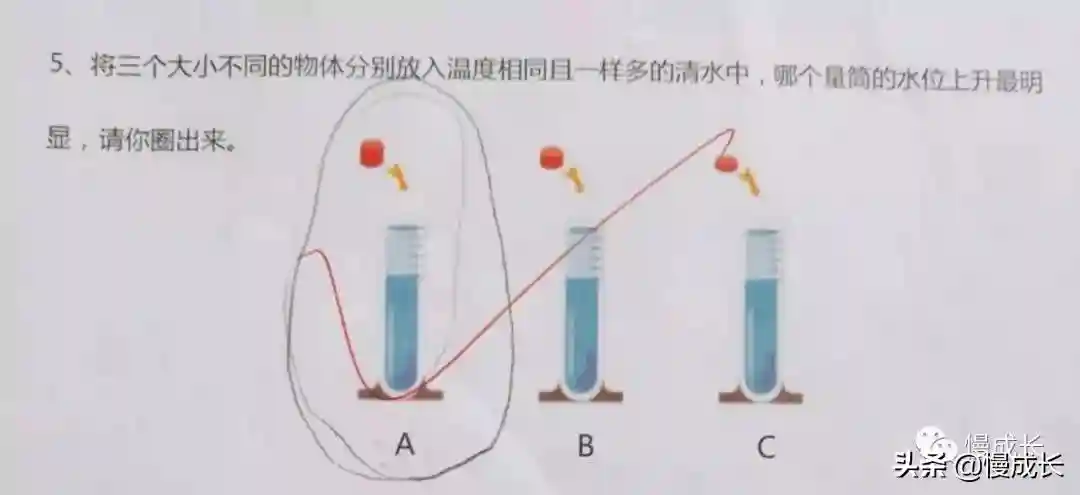 例如,其中一道题是这样的:水位同样高的试管中,放进三个大小不同的物体,哪个试管水位上升最明显?——其实是体积的量化。