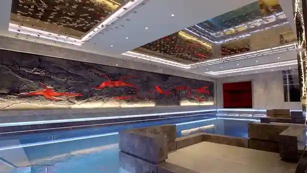 这个室内游泳馆便是他的个人创意,他把这里完全打造成一种热带风情,为些还养了很多热带鱼。