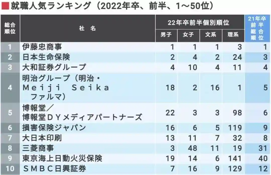 伊藤忠商事去年在男性学生和文科学生的期望就职企业中排行第一,今年也成为了女性学生心中的。在理工科学生的排名中也从第7名提升到第2名,可谓是获得了全属性学生的支持。