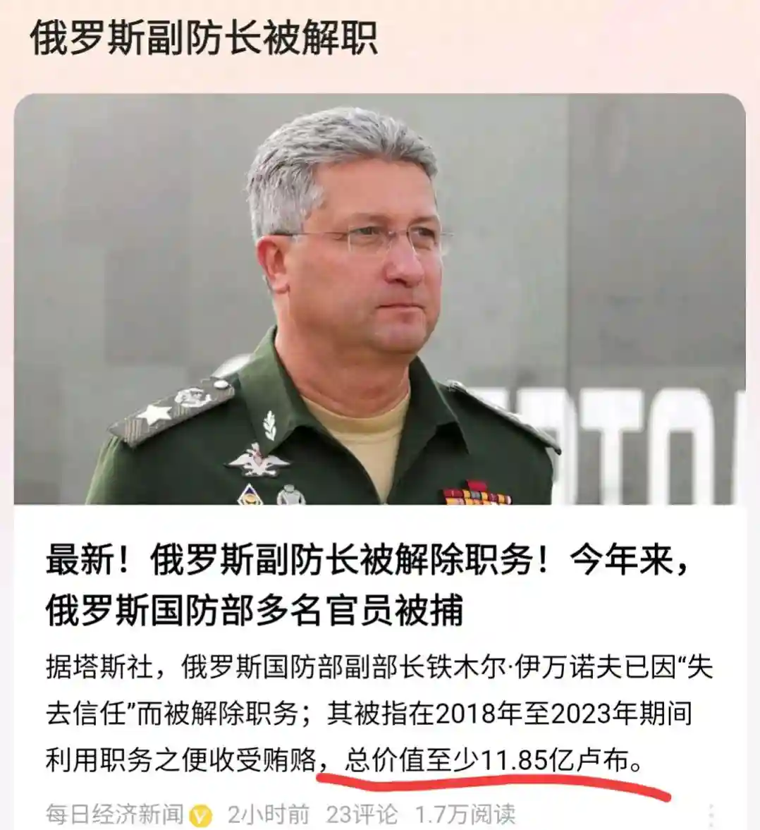 并且,最近俄罗斯国防部多名高官被查,从公开的他们涉及的巨大金额也能看出来,俄罗斯确实不缺钱。