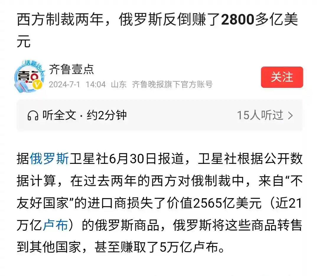 不过据俄罗斯官方报道,与制裁前出口额相比,反而多赚了309亿美元(5万亿卢布),这两年出口赚了至少2875亿美元。