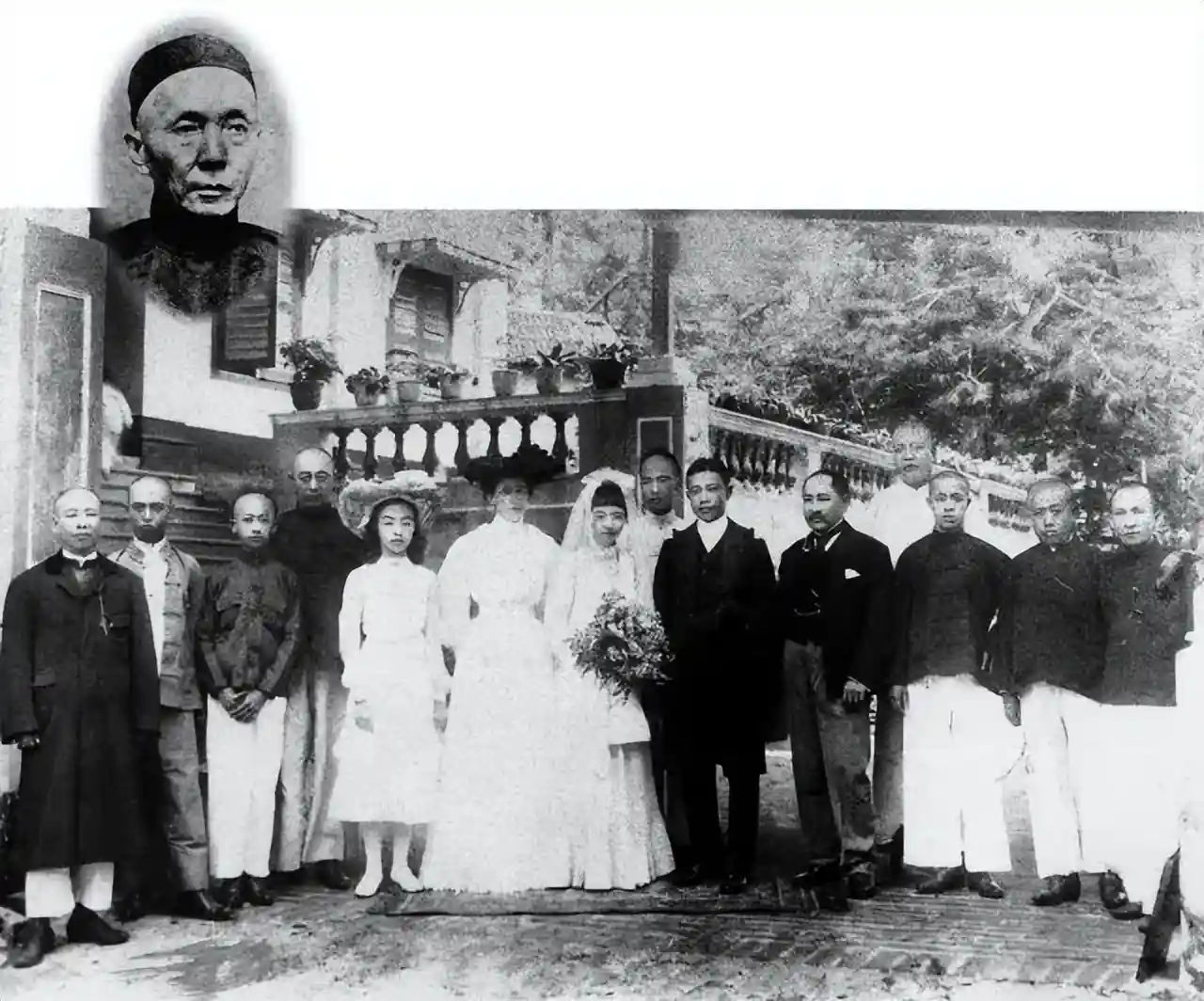 伍连德结婚照,前右四为林文庆。上为黄乃裳