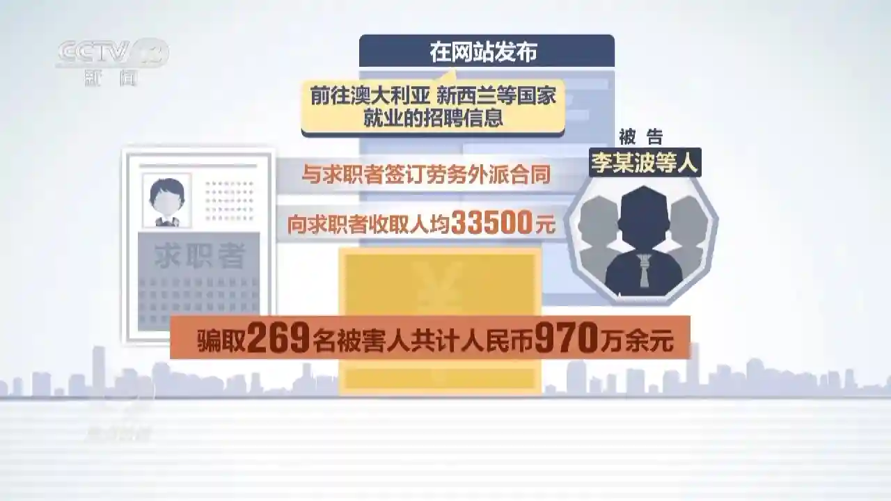 2023年5月,北京市房山区法院也判决了一起出国劳务诈骗案,被告李某波因诈骗罪一审判决13年6个月有期徒刑。判决书显示:被告李某波等人冒用北京一家劳务派遣有限公司名义开展业务,在网站发布前往澳大利亚、新西兰等国家就业的招聘信息,与求职者签订劳务外派合同,向求职者收取人均33500元的费用,最终骗取269名被害人共计人民币970万余元。检察官还总结了这类诈骗案的几个特点。