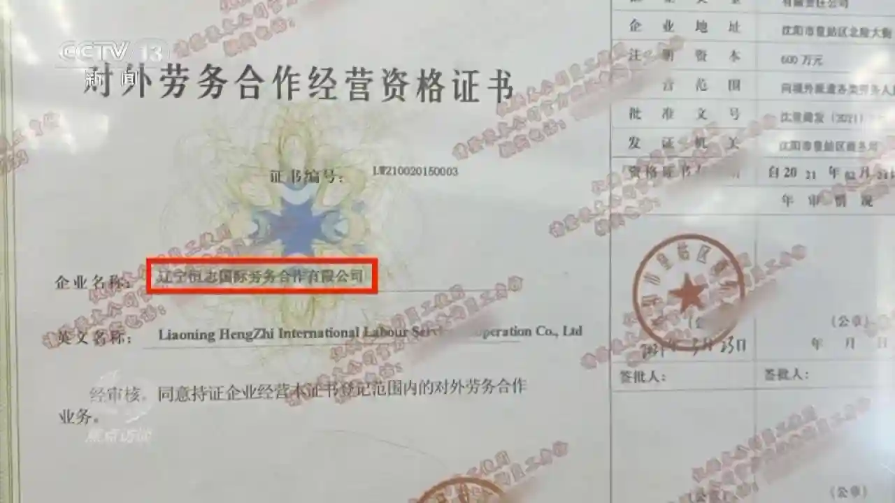 在办公室摆放的证件是一家名为辽宁恒志国际劳务合作有限公司的对外劳务合作经营资格证。为了防止别人冒用自己的资质,在证件上明确写着“仅供本公司员工使用”,还印上了公司的核实电话。按照这个号码,记者联系了辽宁恒志国际劳务合作有限公司,公司负责人却表示不认识众国国际。