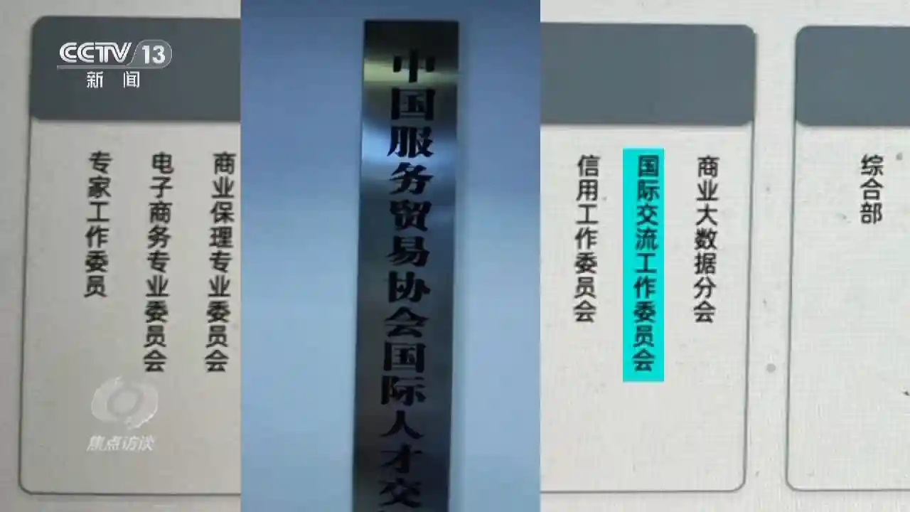 这类中介公司惯用的还有一个招数是“拉大旗作虎皮”。一家名为肆海国际的公司工作人员在朋友圈宣称自己是商务部协会成员,还声称商务部-中国服贸会下设的国际人才交流委员会已经在公司正式揭牌挂牌。然而,记者从中国服贸会的官方网站查询到,服贸会下设的是国际交流工作委员会,并没有国际人才交流委员会这个机构设置。当记者来到这家公司了解情况时,发现门口这个牌子又不见了。