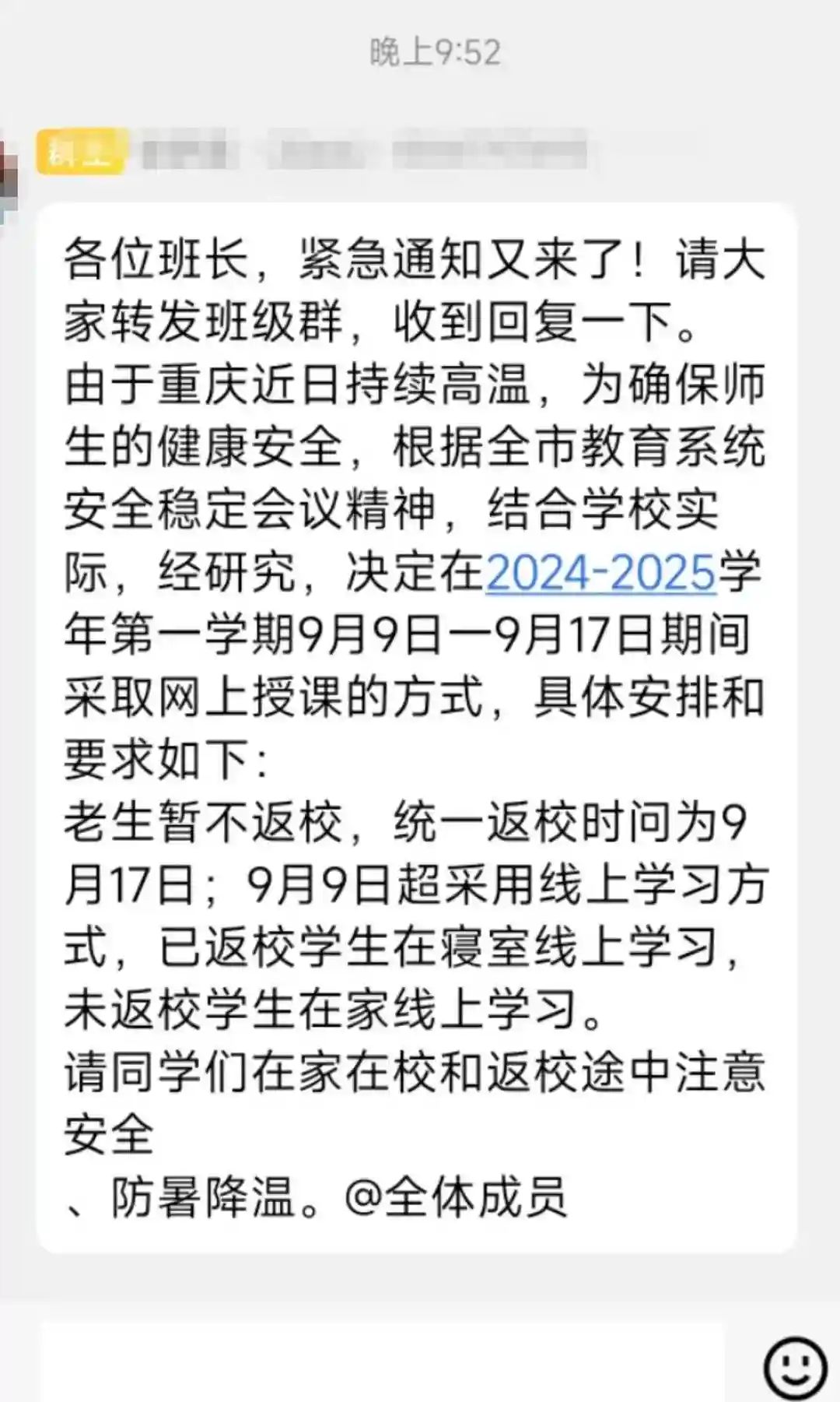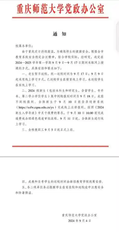 重庆师范大学发出的通知称,“为确保师生的健康安全,根据(重庆)全市教育系统安全稳定会议精神,结合学校实际,经研究,决定在2024-2025学年第一学期9月9日-9月17日期间采取网上授课的方式。”