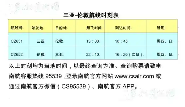 南航三亚-伦敦航线,每周两班,周四、日执行,去程航班CZ651,北京时间13:00从三亚起飞,当地时间18:45到达伦敦;回程航班CZ652,当地时间22:10起飞,北京时间次日16:20抵达三亚,空中飞行时间约12小时45分钟。