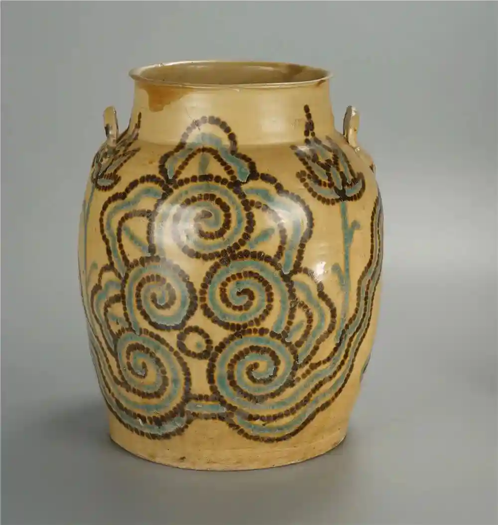 青釉点褐蓝彩云荷纹双耳罐扬州市革委会工地出土扬州博物馆藏长沙窑瓷器上频繁装饰联珠纹,主要是受萨珊波斯文化影响,这是西亚民族常用的纹样。