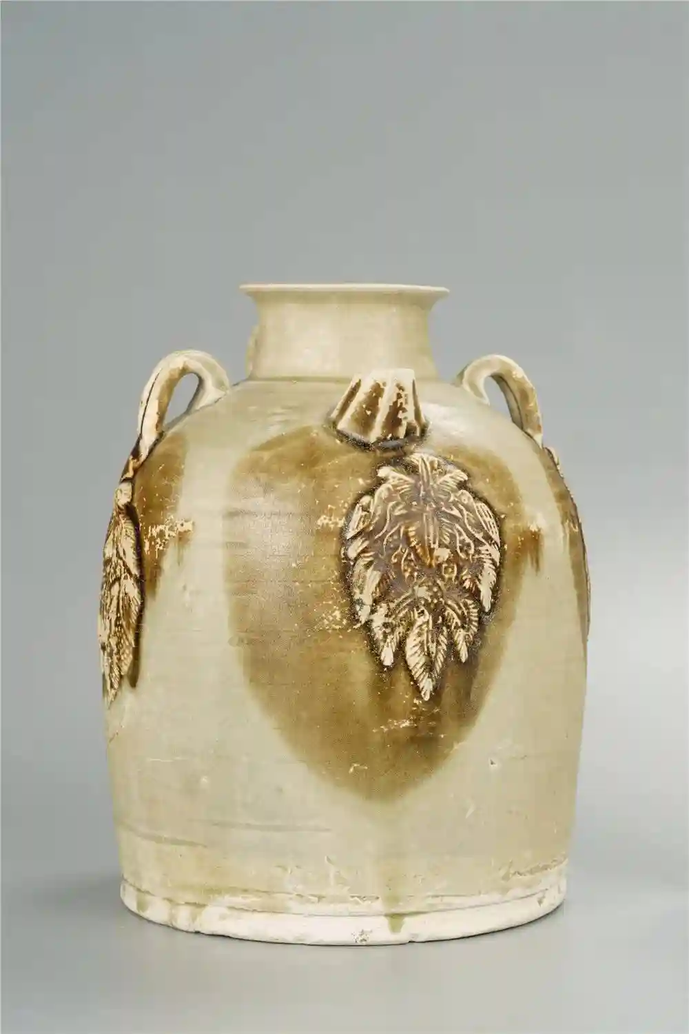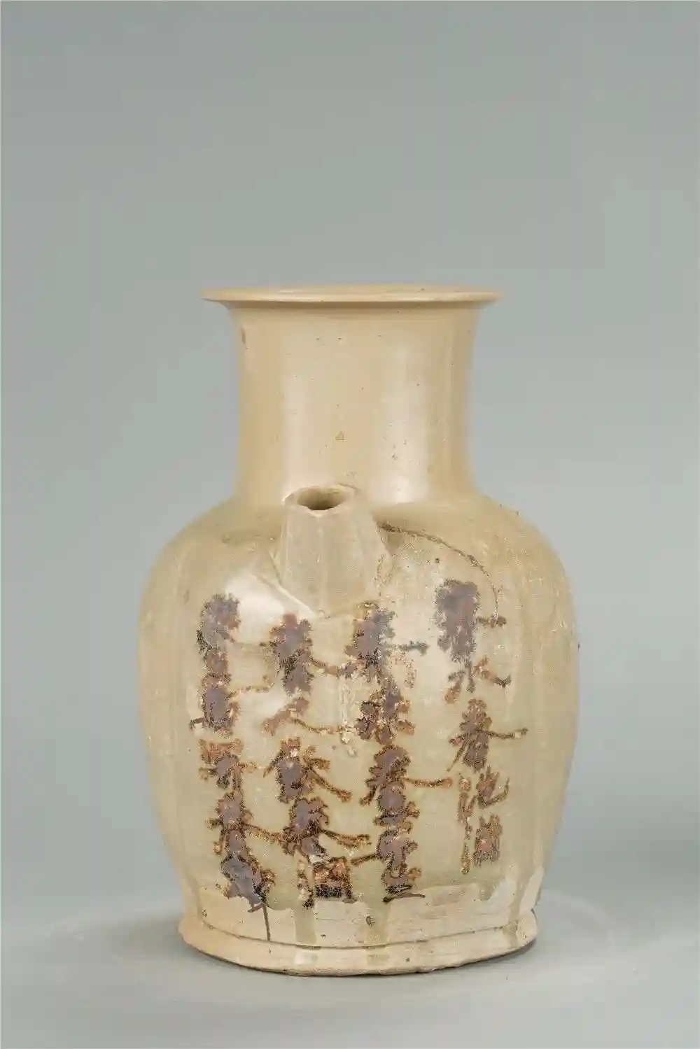 青釉褐斑模印贴椰枣瓷壶黑石号沉船出水长沙铜官窑遗址管理处藏褐斑装饰可能源于粟特银器在装饰处鎏金的工艺效果,椰枣、胡人乐舞等纹样具有明显的域外特征。
