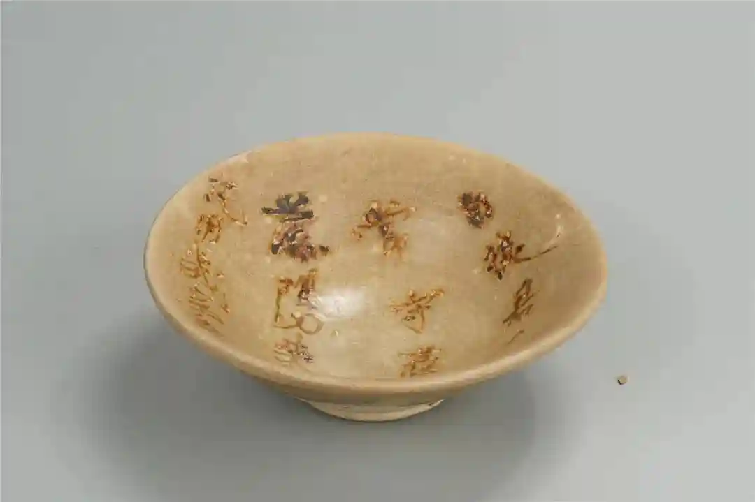青釉褐斑彩绘云气纹瓷碗黑石号沉船出水长沙博物馆藏长沙窑窑工在书写阿拉伯文字的书写过程中,开始自主模仿改造,逐渐使其演变成中式风格的山水、云草。