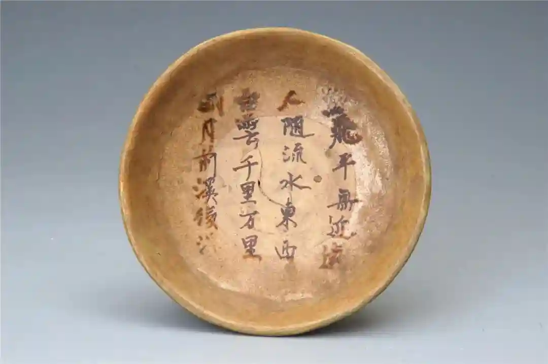 “鸟飞平无(芜)近远”诗文瓷盘长沙望城铜官窑窑址出土长沙博物馆藏题诗:鸟飞平无(芜)近远,人随流水东西。
