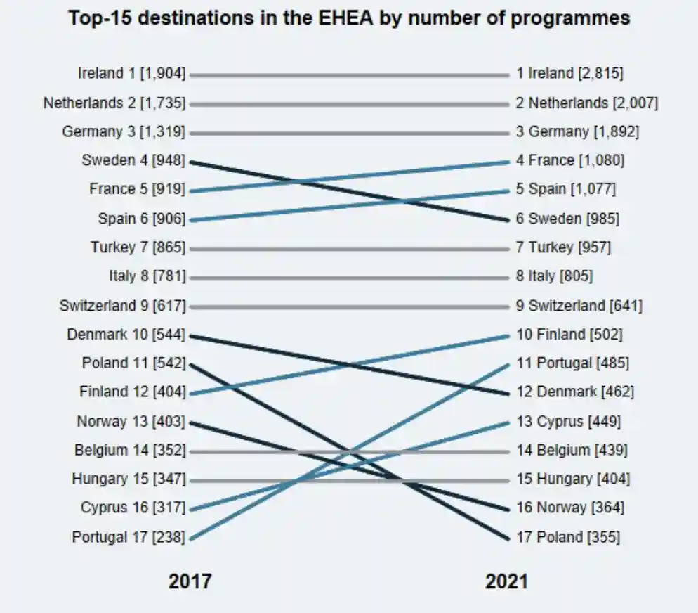 在除上述四国外的在近2.8万个英语授课项目中,有63%的项目在欧洲高等教育区国家(EuropeanHigherEducationArea,下称EHEA),截至2021年5月,在这48个欧洲国家中,爱尔兰提供的英语授课课程位列第一,达2776个,自2017年以来数量增长了近四成;其次是荷兰,提供1900个英语授课项目,德国大约1800个,位居第三。紧随其后的是法国、西班牙、瑞典和土耳其等国。